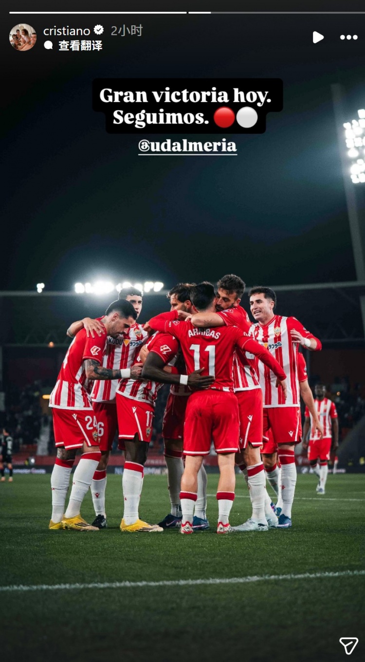 此役过后阿尔梅里亚升至西乙积分榜第二位,作为这家俱乐部的股东,C罗社媒晒出球员们的照片,配文:“今天取得重要胜利,继续前进。”